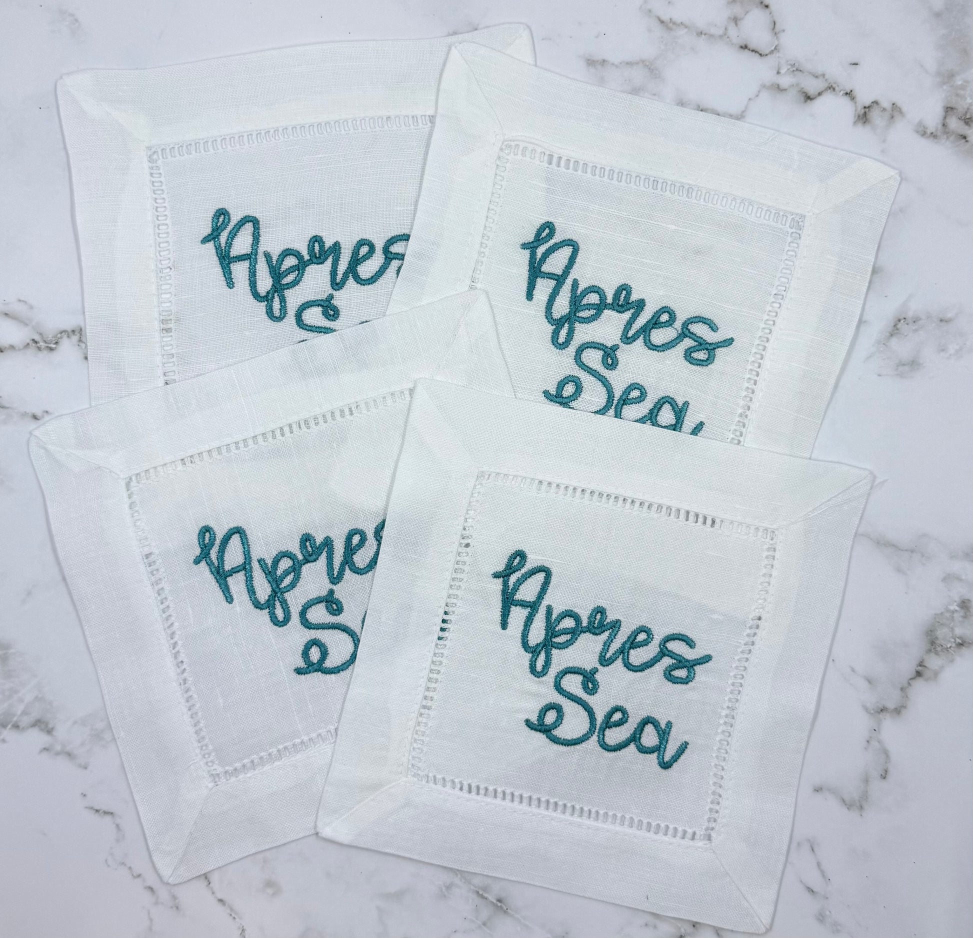My napkins are embroidered to order in Sarasota, FL on white linen cocktail napkins with a hemstitch border and mitered corners.