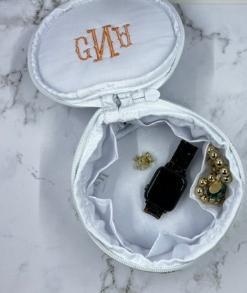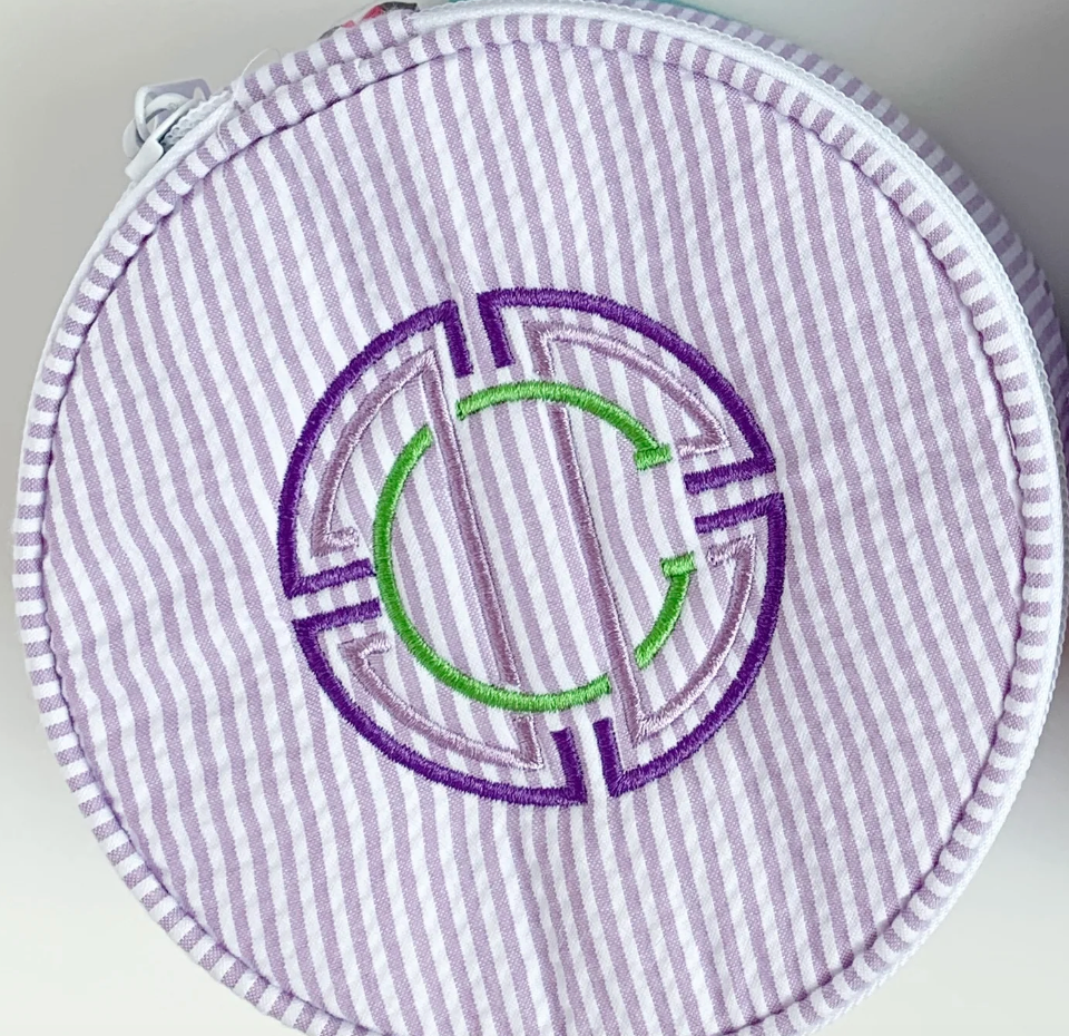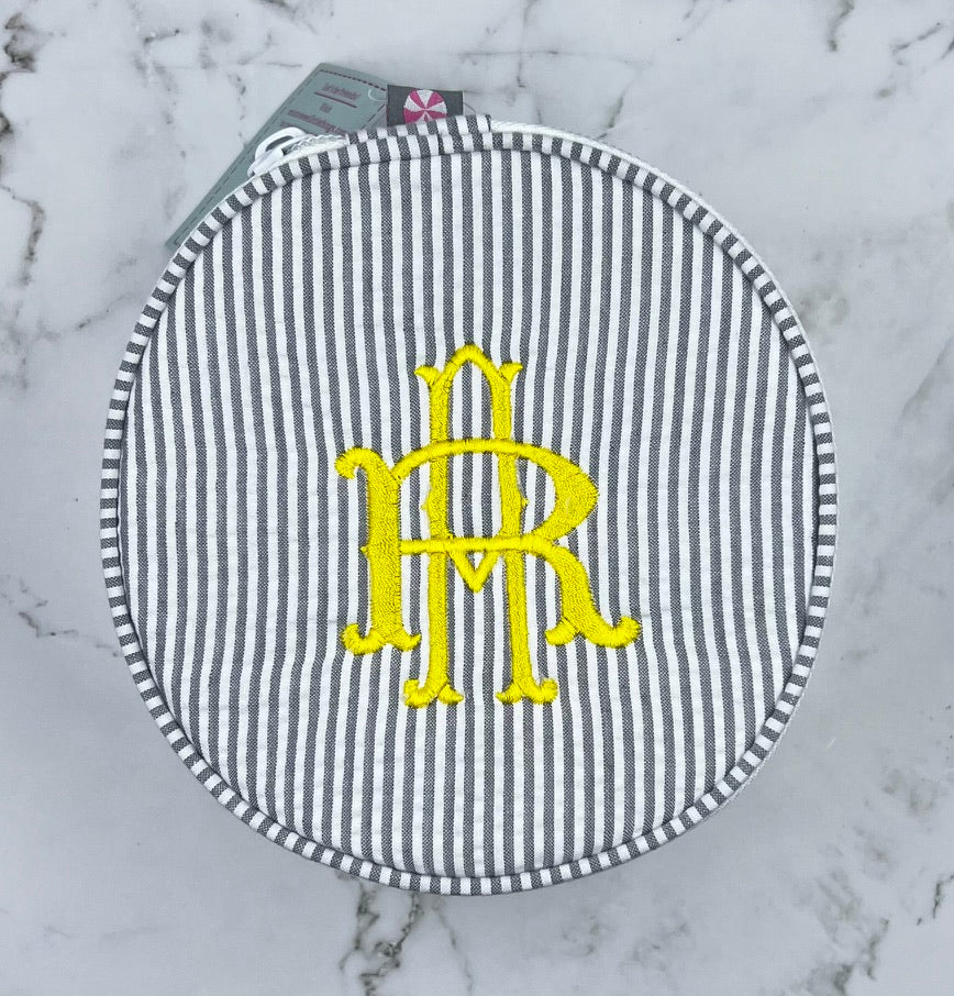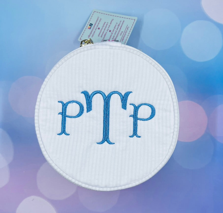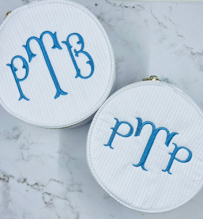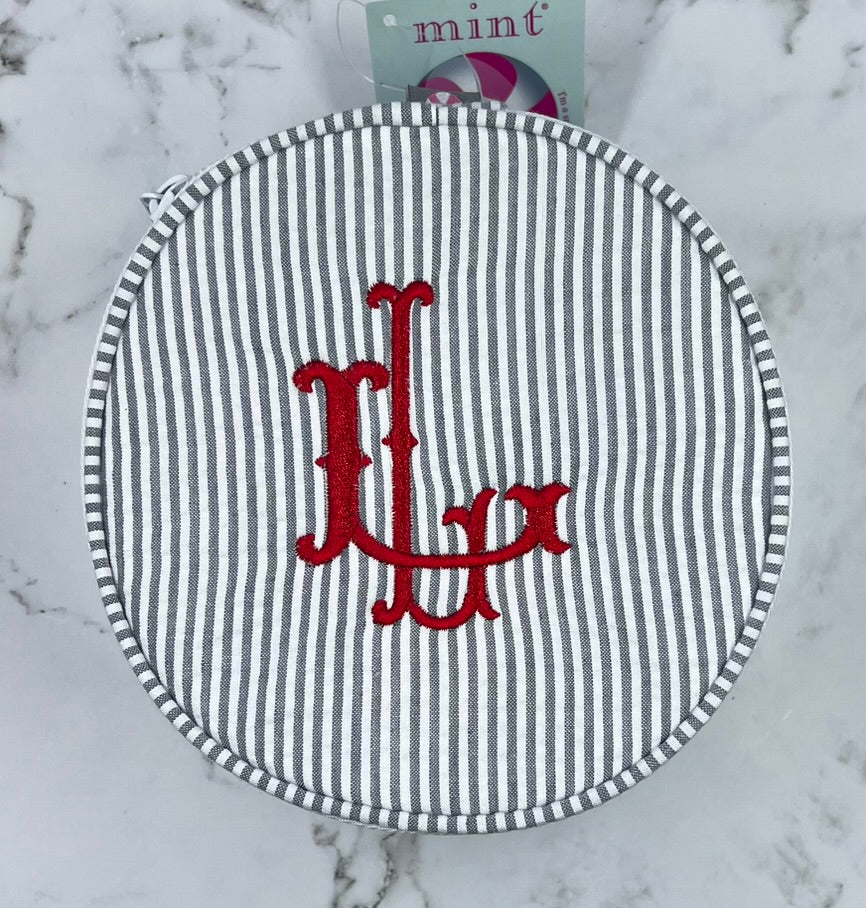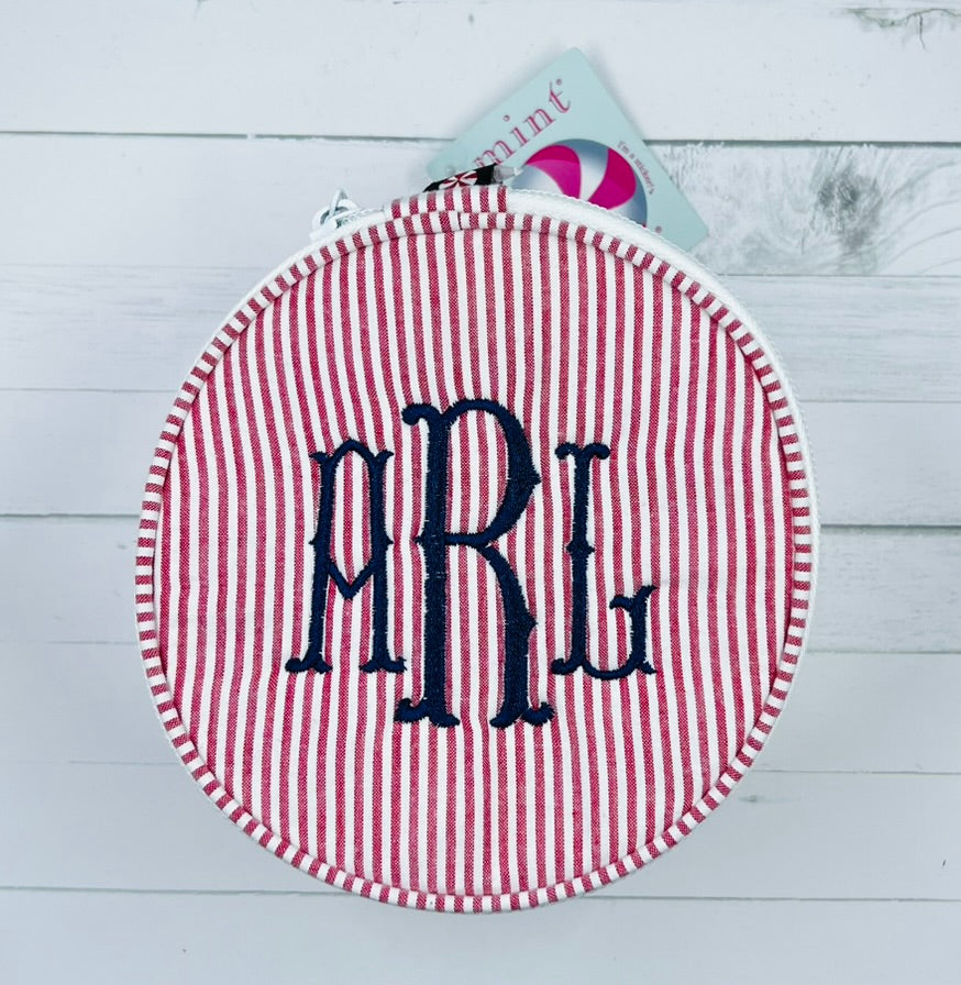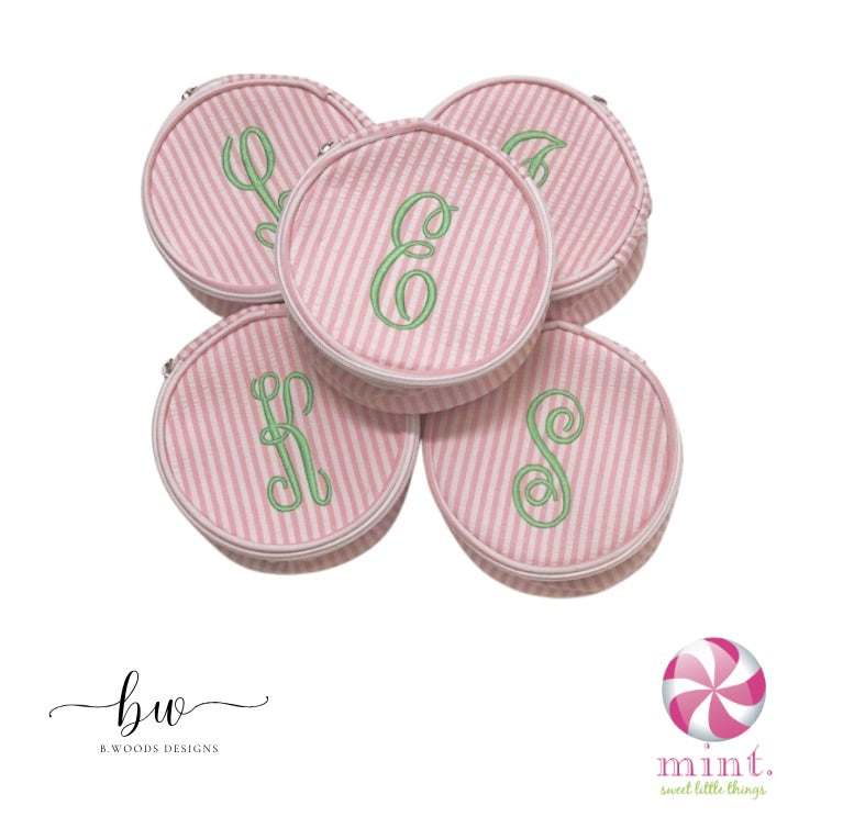 Jewelry rounds, by Mint Sweet Little Things. Available in white, navy, baby blue, red, and lilac seersuckers. Padded and lined with little open pockets for jewelry and makeup, hair bows and toy cars. Pair it with a matching train case and you have a super swell gift!